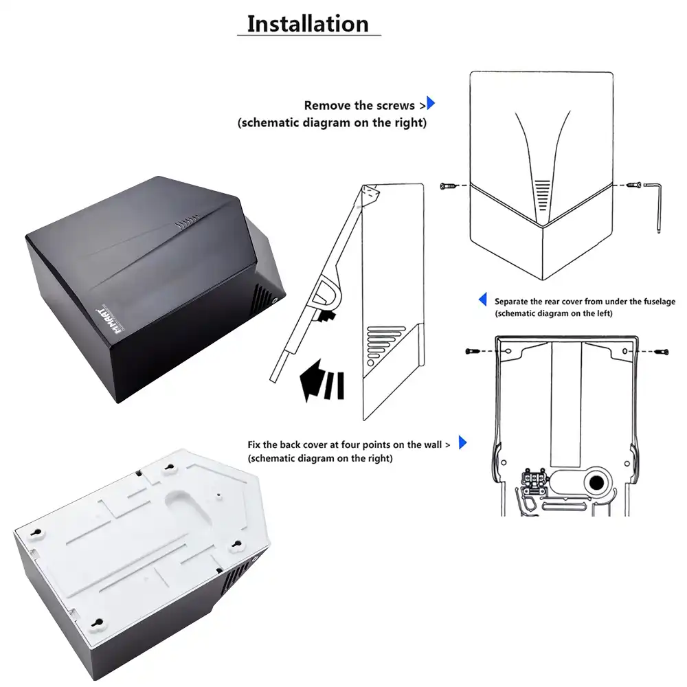 The Automatic Hand Dryer Black is designed for straightforward installation. Users can easily separate the rear cover from the main unit, fix it to the wall at four points, and then reattach the fuselage. This wall-mounted design saves space and provides a clean, integrated look.