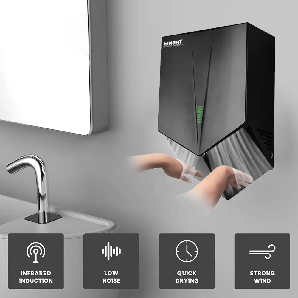 Automatic Hand Dryer Black from MAAT QUALITY PRODUCTS is a modern and efficient solution for hygiene in various environments. This sleek, black hand dryer is designed for touchless operation, offering a hygienic and quick way to dry hands. Its robust features make it an ideal choice for commercial restrooms, offices, and any public space where cleanliness and efficiency are paramount.