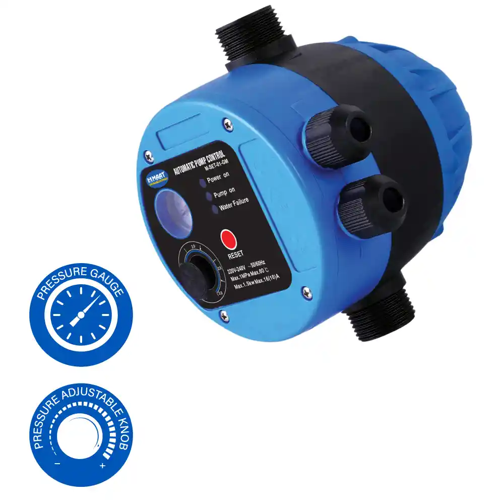 MAAT Automatic Pump Control M-SET-01-GM is a highly efficient and versatile device from MAAT QUALITY PRODUCTS. Designed to automate the operation of water pumps, this unit provides a modern solution for managing water pressure and flow. It features an integrated pressure gauge for real-time monitoring and a manual switch with “MANUAL-AUTO-OFF” settings. This functionality allows for flexible operation, giving users the option to run the pump automatically based on demand or manually for specific tasks. The control unit also includes indicator lights for “POWER” and “RUN” to provide clear status feedback. Manufactured in P.R.C., the M-SET-01-GM model is also CE certified, ensuring it meets European standards for health, safety, and environmental protection.