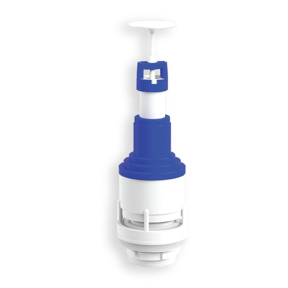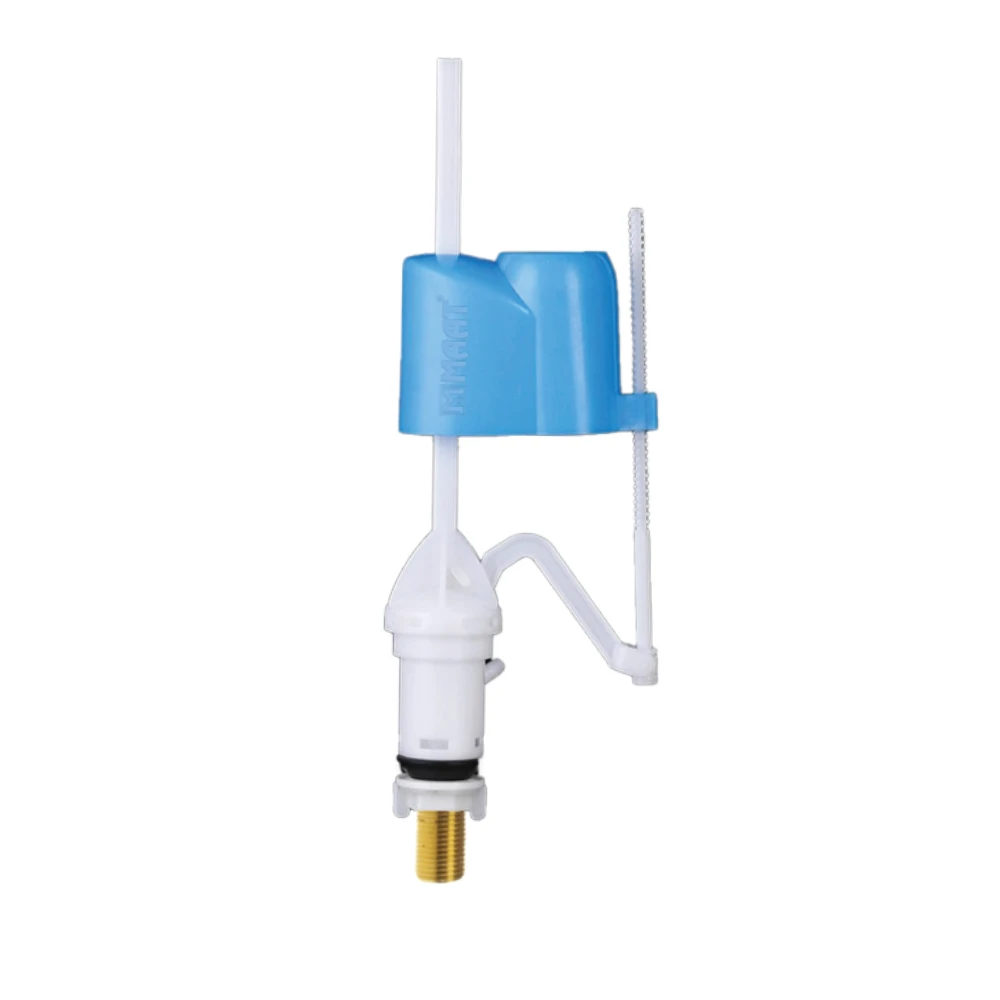 Bottom Entry Fill Valve: The fill valve features a light blue float that slides smoothly on a vertical track. This allows for fine-tuning the water level within the tank, ensuring that the tank fills to the exact required height every time without overflowing. The connection at the base is reinforced with durable threading for a secure attachment to the water supply line.
