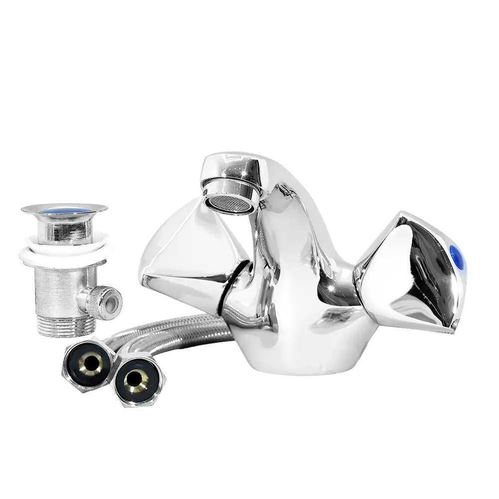 Elevate your bathroom with the MAAT Double Handle Basin Mixer, a classic fixture that combines elegant design with superior functionality. This high-quality basin mixer from MAAT QUALITY PRODUCTS features a brilliant, polished chrome finish, adding a touch of sophistication to any bathroom decor. Its durable metal construction ensures long-lasting performance, providing reliable hot and cold water control for a comfortable handwashing experience. This complete set includes the basin mixer, flexible hoses, and a matching waste fitting, offering a seamless solution for your wash basin.