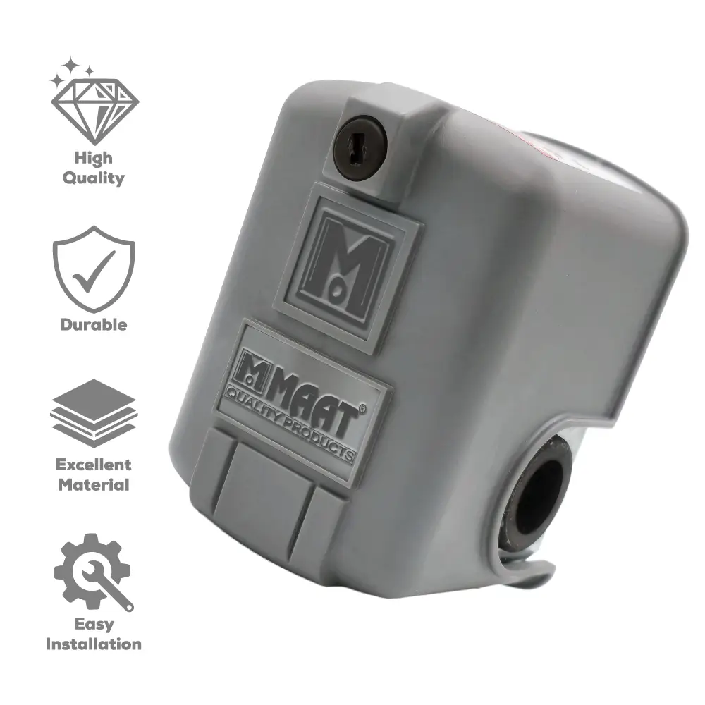 MAAT Pressure Switch M-FSG2AB is a reliable and essential component for any water pump system. Manufactured by MAAT QUALITY PRODUCTS, this device is designed to automatically control the starting and stopping of a pump based on a set pressure. This intelligent operation ensures a consistent and reliable water supply while also protecting the pump from continuous running and potential damage. The pressure switch is marketed as being of “High Quality” and “Durable”, making it a dependable choice for both residential and light commercial applications.