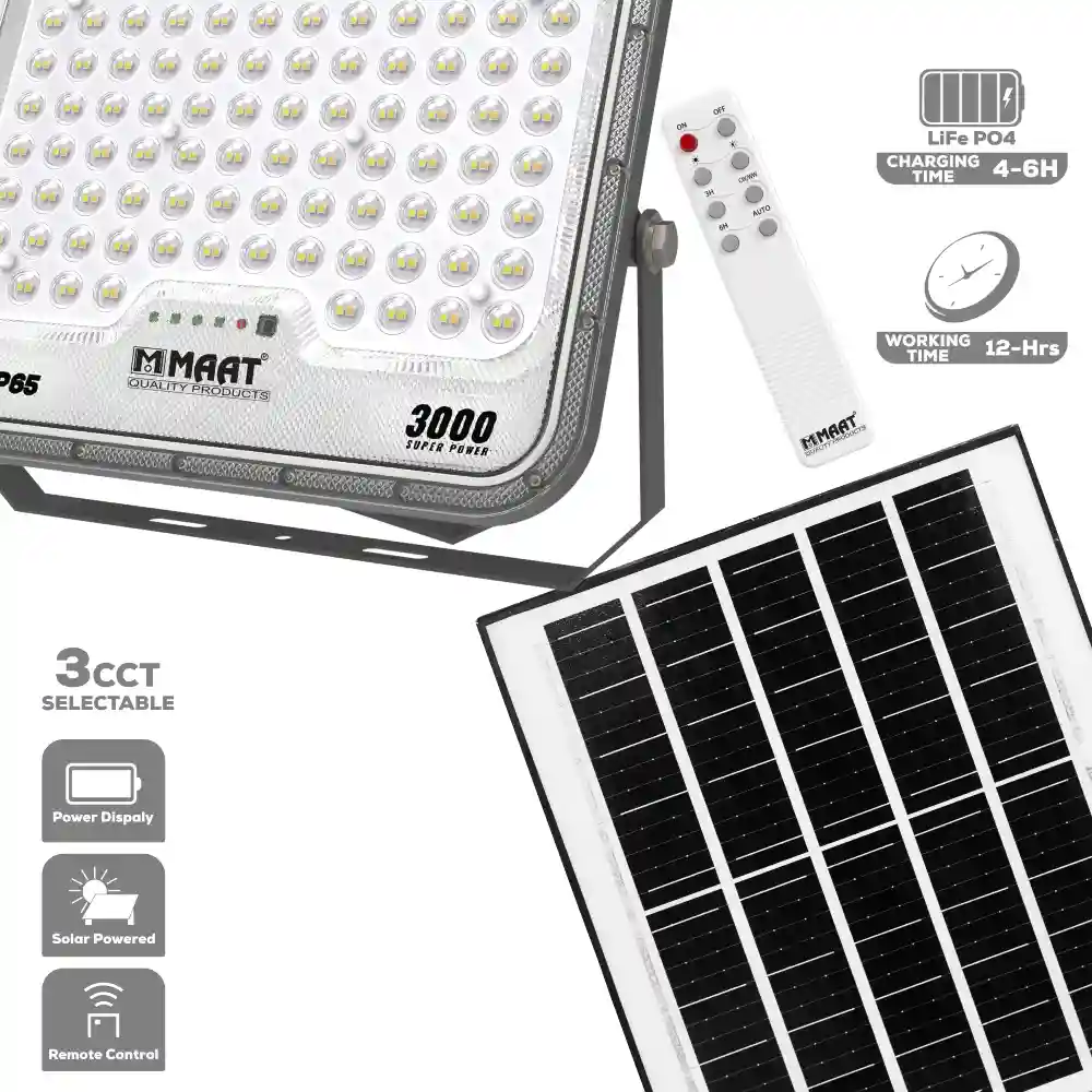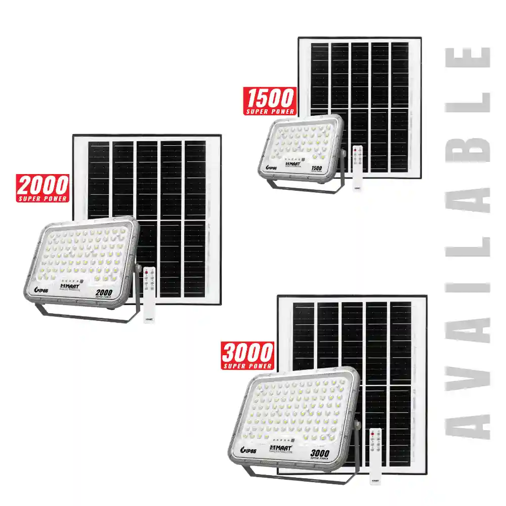 The MET-SFG9 series is a Professional Grade Solar LED Floodlight designed for maximum coverage. The MET-SFG9-1500 features a compact 198x160x47.3mm lamp size, while the massive MET-SFG9-3000 scales up to 283x227x47.3mm to house a higher LED density. Every MAAT Solar Flood Light 3CCT includes a power display on the lamp face, allowing you to monitor the battery status in real-time. Backed by a 1-year warranty, these lights are packaged in protective foam and a color box to ensure they arrive in perfect condition. From the 1500 super power to the 3000 super power model, MAAT delivers a robust, high-conductivity, and maintenance-free lighting solution for the modern world.